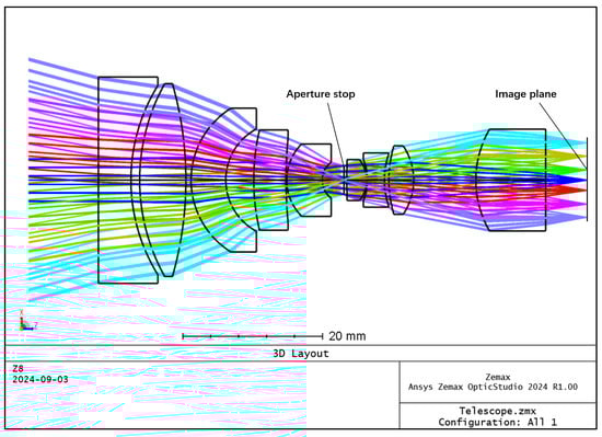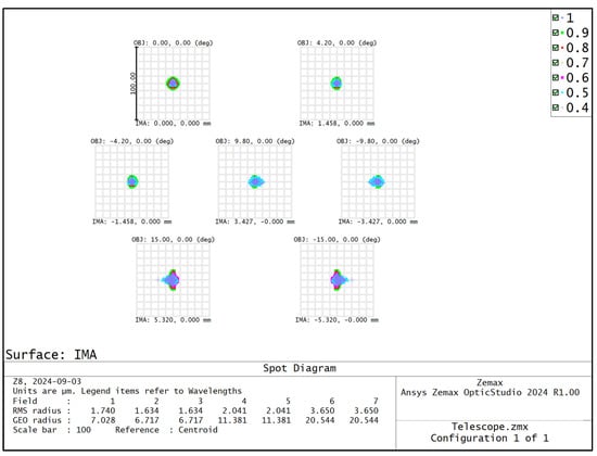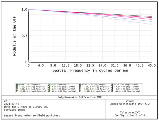 The spatial resolution of the hyperspectral imager is primarily determined by the telescope system. The front telescope system features a field of view of 30° and a relative aperture of 1/3, providing both a wide field of view and a significant relative aperture. To achieve optical pupil matching, the front telescope system employs an image-square telecentric optical path, while the spectral imaging system utilizes an object-square telecentric structure. The front telescope system is designed on the basis of the double Gaussian objective lens structure for complexity, and the structure of the front telescope system is shown in Figure 1. The distribution of the dot pattern on the image plane of the front telescope system is shown in Figure 2, and the radius of the RMS value of the dot pattern in the full field of view is less than 3.7 μm. The modulated optical transfer function curve of the front telescope system is shown in Figure 3, and the MTF is more than 0.8@45 lp/mm, which obtains good imaging quality in the full field of view at the same time.