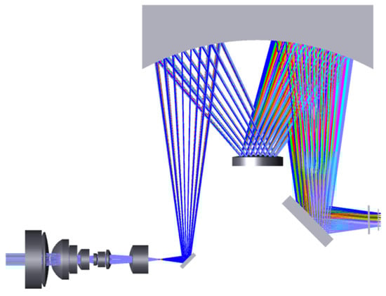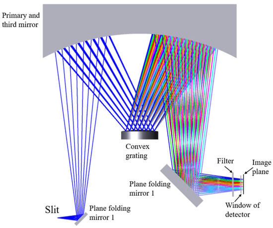 The spectral imaging system features a slit length of 11 mm and a numerical aperture of 0.17, characterized by a large relative aperture and an elongated slit. In contrast to interferometric spectral imaging methods, the dispersive spectral imaging approach allows for intuitive spectrum acquisition without necessitating complex computational processing. Additionally, compared to prism-based dispersion spectral imaging, grating dispersion spectral imaging offers improved dispersion linearity and higher spectral resolution. The Offner spectral imaging system based on convex grating dispersion is a new type of spectral imaging system developed on the basis of the reflective Offner relay optical system, with two spherical mirrors as the primary mirror and three mirrors and a convex grating as the second surface. In the initial structure of the Offner relay optical system, the primary mirror and the three mirrors have the same radius of curvature and center of curvature and the aperture diaphragm in the secondary mirror, so the system’s entry and exit pupils are located at infinity, and the system can be regarded as symmetric about the diaphragm system; the coma and aberrations are eliminated due to the symmetry. When the second surface is replaced by a grating, although the symmetry of the system is destroyed to a certain extent, the detector angle can be adjusted appropriately to obtain good imaging quality in a wide band at the same time. Compared with the conventional method of using gratings in collimated beams, the Offner spectral imaging system has the advantages of small size, light weight, and low spectral bending and color distortion. In order to further reduce the size and weight of the whole system, planar folding mirrors 1 and 2 are incorporated in the incident and exit arms, respectively. The Offner spectral imaging system is an off-axis optical system, and the main mirror and the three mirrors share the same spherical mirror in order to facilitate the mounting and adjusting. The optical structure of the Offner spectral imaging system is shown in Figure 4, with spectral dimensions in the paper plane and spatial dimensions in the direction of perpendicular to the paper plane. The band range of the spectral imaging system is 400–1000 nm, and negative filters are added in front of the detector window in order to avoid grating-level interference.