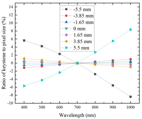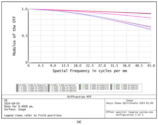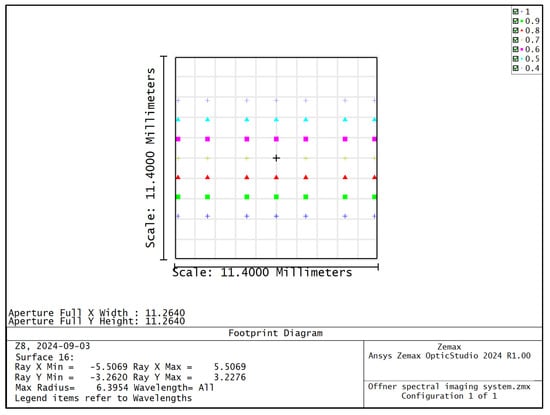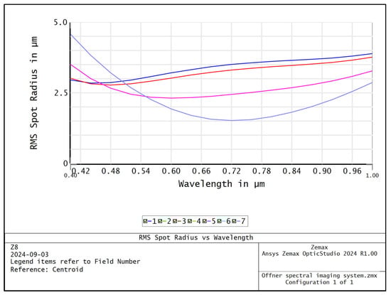 The MTF curves of different wavelengths of the Offner spectral imaging system are shown in Figure 5, and the MTFs at the center and edge wavelengths are more than 0.6@45 lp/mm. Figure 6 shows the relationship between the radius of RMS value of the dot-plot and the wavelength, and the RMS values of the dot-plot of the different fields of view in the range of 400–1000 nm are all less than 4.6 μm, which means that the surface spectral imaging system obtains good imaging quality within the range of a wide range of wavelengths. The surface spectral imaging system obtains good imaging quality in a wide range of wavelengths, which meets the design index requirements of the spectral imaging system. Figure 7 shows the light imprint on the image surface of the spectral imaging system, the dispersion range of the 400–1000 nm band on the image surface is 6.466 mm, the width of the slit S is 22 μm, and the diameter of the diffuse spot of the dot-row diagram D is 9.2 μm; then, the design spectral resolution (FWHM) Δλ of the Offner spectral imaging system can be expressed as follows: