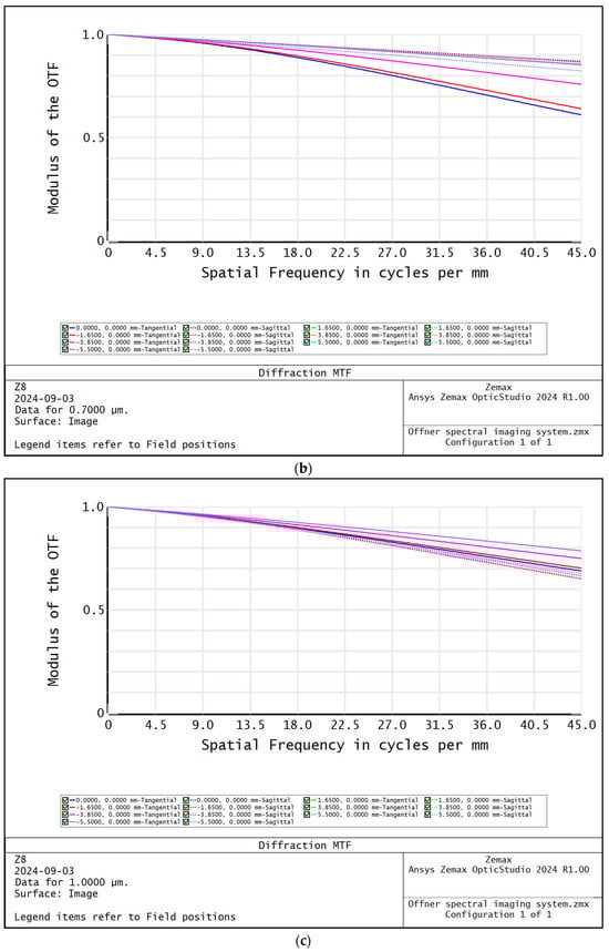 MTF curves for different wavelengths of Offner spectral imaging system: (a) 400 nm; (b) 700 nm; (c) 1000 nm.