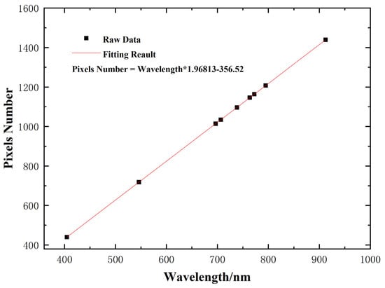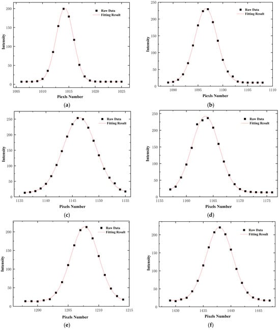 Since a mercury lamp has the advantages of narrow emission spectral lines, high intensity, stable operation, and known characteristic wavelengths, a mercury lamp can be used as a spectral calibration light source. After sufficient preheating of the mercury lamp, it is placed directly in front of the slit of the spectrometer to irradiate the hyperspectral imaging instrument and obtain the original data image of the mercury lamp spectral lines on the detector image plane of the hyperspectral imaging instrument. Because the image resolution is 2048 × 2048, and the spectral line curvature of the hyperspectral imaging system developed with this paper is very small, using MATLAB R2023a to read the 1024th line in the middle of the image for calibration can well represent the linear relationship between wavelength and pixel. We next extract data from several characteristic wavelengths, including 404.66 nm, 546.08 nm, 696.54 nm, 706.72 nm, 738.40 nm, 763.51 nm, 772.40 nm, 794.82 nm, and 912.30 nm, for Gaussian fitting. Partial fitting results are shown in Figure 13, which can obtain the center pixel position of the characteristic wavelength and calculate the full width at half maximum (FWHM). Then, each feature wavelength is linearly fitted with the center pixel position obtained by Gaussian fitting, and the linear correspondence between pixel values and the center pixel position is obtained. The linear fitting results are shown in Figure 14, and the spectral resolution calculation results are shown in Table 2.