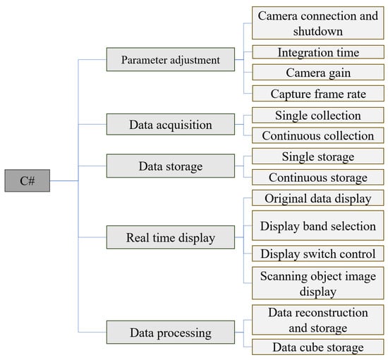 The software system adopts a modular and integrated design concept, and five modules including instrument parameter tuning, data acquisition, data storage, real-time display, and data processing were designed and developed according to the functional requirements of the software, as shown in Figure 15. The five modules are independent of each other and can be called through the set interface. The instrument tuning module sends tuning instructions by calling the interface in the detector SDK to set the camera integration time, camera gain, and acquisition frame rate. The data acquisition module controls the camera acquisition mode and preprocesses the collected raw spectral data into images, which are then transmitted to the interface for real-time display. The data storage module stores the collected raw spectral data in the selected data format. In the real-time display module, one can select the desired frequency band to display. The built-in algorithm of the module will process and concatenate the scanned object image of the selected frequency band and display it in real-time on the interface. The data processing module cuts and splices the collected and stored raw spectral data to achieve image reconstruction, outputting monochrome images in different bands, and can also further output cube data in ENVI standard format.