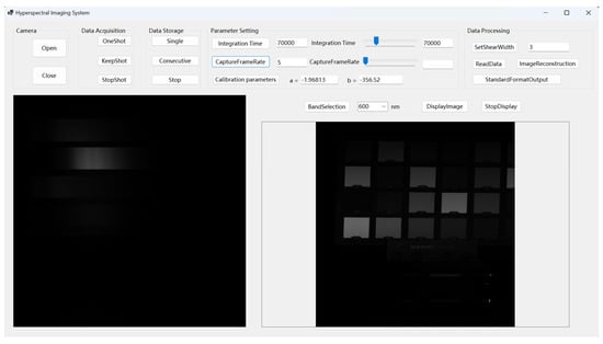 The main design interface is depicted in Figure 16. The upper section comprises the functional button area for each module, while the lower section consists of two image display areas. The first display presents the collected raw spectrum to facilitate focusing, and the second displays the real-time visualization of the reconstructed object image based on the selected spectral data. This arrangement allows for a more effective assessment of both the quality of the acquired data and the progress of the scanning experiment. During the experimental process, it is imperative to perform data acquisition, data display, data storage, and real-time visualization of single-band object images simultaneously. To achieve this, the software design of the system employs multi-threaded programming. This methodology prevents prolonged CPU occupation by individual tasks, thereby significantly enhancing the efficiency of hyperspectral imaging.