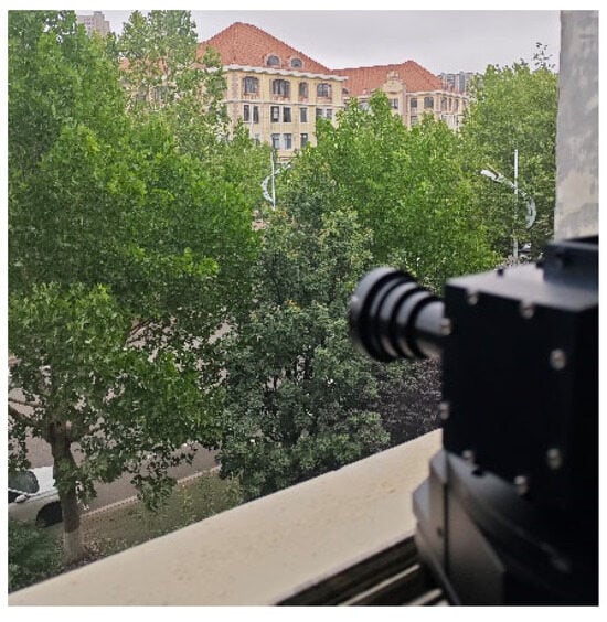 Following the completion of the study on the high-resolution convex grating dispersive hyperspectral imager system, the system prototype underwent performance testing experiments. Under clear weather conditions, the hyperspectral prototype was mounted on a rotary displacement stage positioned in a window, as depicted in Figure 17. The rotational speed and direction of the stage were configured, and the developed control software was utilized to adjust the parameters of the hyperspectral camera. The rotary stage was then activated to commence data storage, continuing until the maximum displacement was reached, at which point data storage was halted. The data processing module integrated within the software subsequently analyzed the collected raw data, generating monochromatic images for various wavelengths. Specifically, monochromatic diagrams corresponding to wavelengths of 500 nm, 600 nm, 700 nm, and 800 nm are presented in Figure 18.
