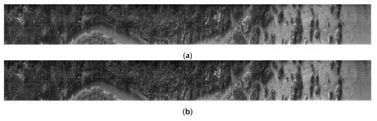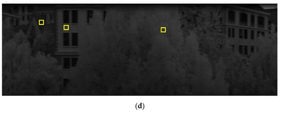Monochromatic images at different wavelength bands from the outdoor push-scan of the hyperspectral imaging system: (a) monochromatic image in the 500 nm wavelength band; (b) monochromatic image in the 600 nm wavelength band; (c) monochromatic image in the 700 nm wavelength band; (d) monochromatic image in the 800 nm wavelength band.