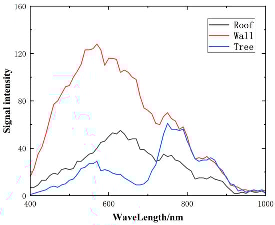 The monochromatic images indicate a high level of imaging quality. In Figure 18d, the 800 nm monochrome map highlights three specific locations: the red roof, the yellow wall, and the green tree. Spectral data acquired from these positions were plotted to generate the spectral curves presented in Figure 19. The analysis reveals that the red roof exhibits a prominent peak at 630 nm, while the yellow wall shows a peak at 570 nm. Additionally, the green leaves demonstrate peaks at both 560 nm and 760 nm. The distinct characteristics of these spectral curves confirm that the designed high-resolution convex grating dispersive hyperspectral imaging system possesses excellent detection capabilities for spectral imaging.