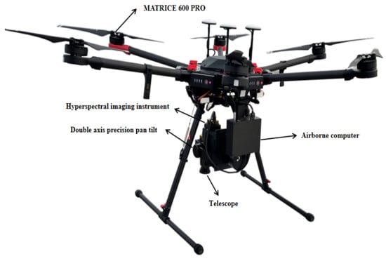 The remote sensing equipment comprises an independently developed high-resolution convex grating dispersive hyperspectral imager system, which integrates sensing, transmission, and computing control functions. The system is primarily divided into five components: the multi-rotor UAV, the precision stabilized gimbal, the on-board computer, the hyperspectral imager, and the control and data acquisition software module, as illustrated in Figure 20. The stabilizing gimbal is securely mounted beneath the UAV, equipped with a built-in self-stabilizing algorithm that enables automatic stabilization upon powering on. The hyperspectral imager is affixed to the gimbal, with its position adjusted so that under the gimbal’s active stabilization, the objective lens of the hyperspectral camera points directly toward the ground. Furthermore, the orientation of the camera’s slit is configured to be perpendicular to the flight direction of the UAV. The microcomputer is mounted at the rear of the gimbal bracket, with both the computer and gimbal connected to the UAV’s power supply. The hyperspectral camera interfaces with the microcomputer via a data cable. The on-board computer is equipped with proprietary camera control software that facilitates the collection, storage, and processing of data.