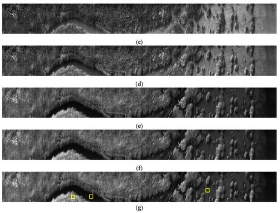 Monochromatic images of Spartina alterniflora captured by unmanned aerial vehicle hyperspectral system in different frequency bands: (a) monochromatic image in the 560 nm wavelength band; (b) monochromatic image in the 600 nm wavelength band; (c) monochromatic image in the 650 nm wavelength band; (d) monochromatic image in the 700 nm wavelength band; (e) monochromatic image in the 750 band; (f) monochromatic image in the 800 nm wavelength band; (g) monochromatic image in the 850 nm wavelength band.