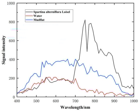 Spectral curves of Spartina alterniflora Loisel, water, and mudflat.