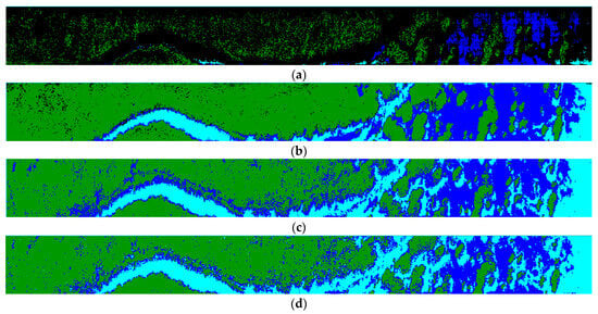 Classification results of hyperspectral data of Spartina alterniflora using different classification algorithms; among them, green represents Spartina alterniflora, light blue represents water area, and dark blue represents mudflat. (a) SAM classification results; (b) SID classification results l; (c) SVM classification results; (d) BPNN classification results.