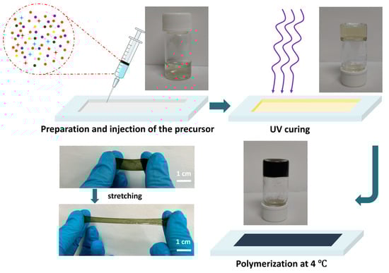 A one-pot preparation method is commonly used in hydrogel construction due to its convenience and moldability. Nevertheless, it was rarely employed to prepare CPHs. In addition to the poor solubility of conductive polymers, there are several conflicts between the gelation of hydrogels and the polymerization of CP monomers. In order to avoid the decrease in conductivity of CPs due to their aggregation during the thermal curing of the hydrogel template, a low-temperature or room-temperature environment is required [4,32]. Therefore, it is more eligible to prepare hydrogels through photocuring. Unfortunately, the darkening of the solution caused by the polymerization of CP monomers is an obstacle to photocuring, while the commonly used oxidants of CP monomers either promote (e.g., ammonium persulfate) or impede (e.g., iron (III)) hydrogel polymerization. Consequently, it is challenging to initiate the polymerization of CP monomers after the photocuring of hydrogel matrices without additional operations.