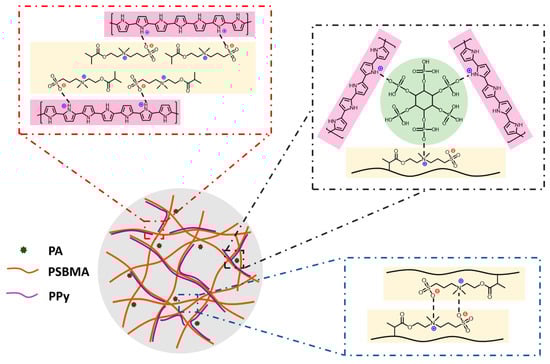Various interactions among components of the PPy/PA/PSBMA hydrogel.