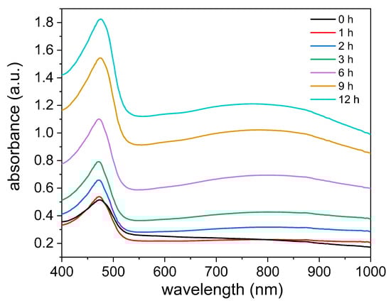 Zwitterionic SBMA was first applied to construct the hydrogel matrix. As shown in Figure 2, abundant interactions exist among PA molecules, PPy chains, and the zwitterionic groups of PSBMA, enhancing the mechanical strength of the hydrogel. In addition to providing noncovalent cross-linking, as an organic doping acid with six dihydrogen phosphate, PA is more efficient in improving the conductivity of CPs compared with inorganic acids [34,35,36]. Moreover, H2O2 was selected as an oxidizing agent for the in situ polymerization of PPy chains without disturbing the hydrogel gelation. Compared to commonly used oxidizing agents, such as ammonium persulfate (APS), potassium persulfate, and ferric chloride (FeCl3), H2O2 would not promote or impede hydrogel polymerization and could oxidize pyrrole in a more gentle manner [37] to avoid PPy aggregation. The UV–Vis spectra of the as-prepared hydrogel during PPy polymerization are shown in Figure 3. The hydrogel exhibits a very low absorbance within the first hour, indicating a highly transparent state, which is a necessary condition for the photocuring of the hydrogel matrix.