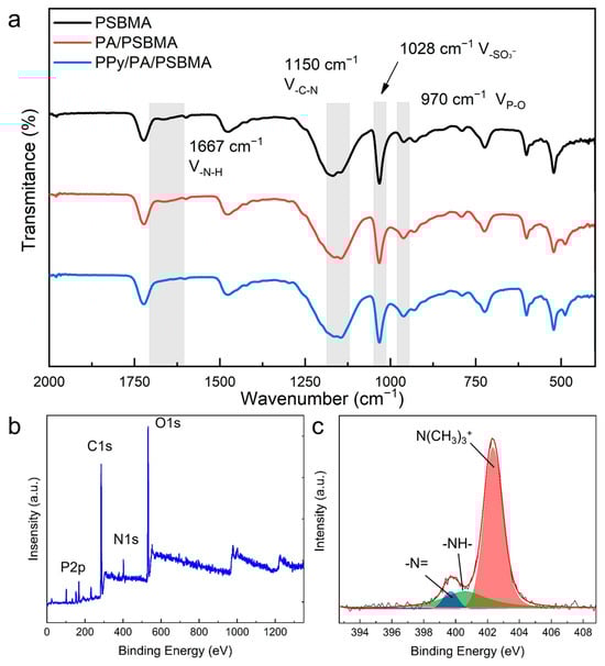 FT-IR and XPS spectra of the hydrogels. (a) FT-IR spectra of the PSBMA hydrogel, PA/PSBMA hydrogel, and PPy/PA/PSBMA hydrogel. (b) XPS spectra of the PPy/PA/PSBMA hydrogel. (c) Magnified spectra of the N1s area.