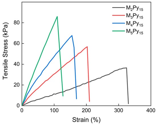 The tensile stress and strain curves of the PPy/PA/PSBMA hydrogels with different cross-linking degrees.