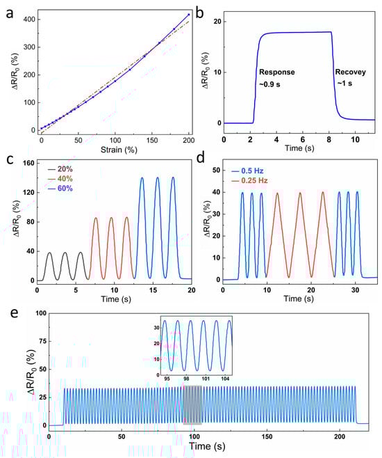 Sensing performance of the PPy/PA/PSBMA hydrogel as a strain sensor. (a) Electrical resistance and strain curves. The original data is represented by a blue line and the linear-fitted curve is represented by a red dashed line. (b) The response and recovery times of the hydrogel. (c) Real-time response curve measured at variable strains. (d) Real-time response curve measured at changeable frequencies. (e) Cycling durability of the hydrogel strain sensor.