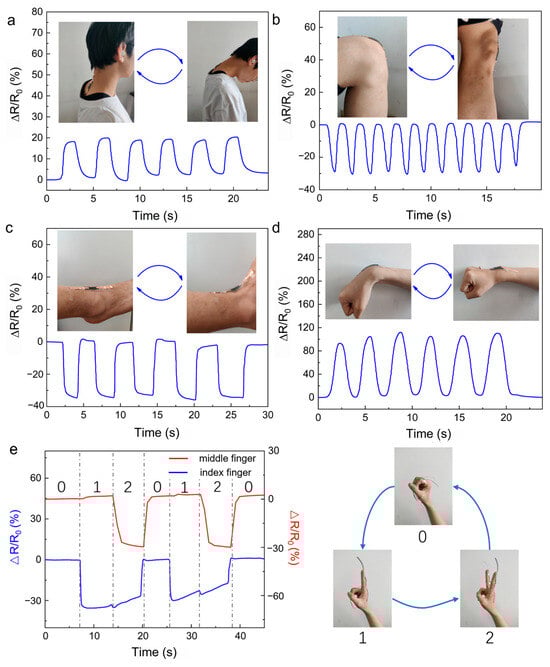 For further applications, an equipped strain sensor was fabricated for human motion detection. The prepared strain sensor could be used to monitor the movements of different parts during sport. The responses of the strain sensors are shown in Figure 7. The cyclic movements of the neck (Figure 7a), knees (Figure 7b), ankles (Figure 7c), and wrists (Figure 7d) caused changes in the expansion and contraction of the sensor, resulting in changes in electrical resistance. It is worth noting that repetitive movements produced stable wave-like responding signals. Moreover, the final response values nearly returned to zero after the movements, demonstrating the stability and efficiency of the as-prepared strain sensor. Furthermore, this strain sensor could be used to recognize the variations in gestures. If a finger were to be bent, the strain sensor would be stretched, resulting in an increase in resistance (shown in Figure 7e).