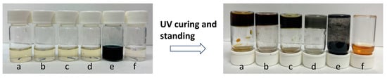 For further research, we selected other commonly used hydrogel monomers for one-pot preparation of CPHs. The detailed materials are listed in Table 3. In the recipes, MBAA was employed as the cross-linking agent to facilitate the formation of elastic hydrogels. PA was added as a doping acid to enable the successful synthesis of PPy networks. H2O2 was used as a mild oxidant to initiate the polymerization of pyrrole. LAP or 2959 was used as photo initiator. It should be noted that, as a commonly used oxidant, APS is capable of initiating the polymerization reaction of both the hydrogel monomer and the CP monomer. The results are presented in Figure 8, responding to trials a–f.