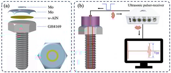 In severe environments, the safety of the connection structures is a key factor in the reliable operation of important equipment, such as aero-engines [1], high-speed trains [2], nuclear reactors [3], and various other industries. Bolts play an important role in component connections and pressure sealing. Monitoring the pretightening stress of bolts is essential for maintaining the safety and reliability of connected structures. Among various preload measurement techniques, ultrasonic measurement techniques based on an acoustoelastic effect have received much attention, with the advantages of real-time, rapid, and accurate measurement [4,5,6]. In this method, an ultrasonic signal is transmitted from the top to the bottom of the bolt by the ultrasonic transducer and then reflected back. By recording the time difference between the signals from unstressed and stressed bolts, the pretightening stress within the bolt can be determined [7,8]. Obviously, the stability and intensity of the received ultrasonic signal are the key factors for measuring the pretightening stress in bolts.