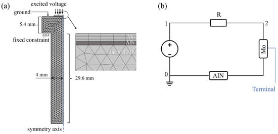 where V0 is the excitation voltage with the value of 60 V and f0 is the frequency with the value of 6 MHz, T is the period with the value of 1/f0. The ground is applied to the upper surface of the bolt head, while a fixed constraint is applied to the lower surface of the bolt head. Moreover, we can achieve more accurate results in our simulations by employing detailed mesh partitioning. A triangular mesh is utilized for the simple bolt model, while a mapping mesh is employed for both the electrode layer Mo and the piezoelectric layer AlN. The model has been optimized by changing the size of the Mo and AlN. In order to transmit and receive signals simultaneously, a reported piezoelectric coupling circuit is applied to the theoretical model [30] (shown in Figure 2b).