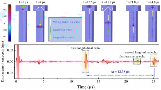 The propagation process of the longitudinal wave, transverse wave, mixing and reflex wave on the bolt is shown in Figure 3. The longitudinal echo goes across the inside of the bolt twice and firstly reaches the bolt head at approximately 12.5 μs, while the second longitudinal echo reaches it at approximately 24.8 μs. We can calculate that the velocity of the longitudinal wave on the Inconel 718 bolt is about 5654 m/s. Mixing and reflex waves are observed at approximately 4 μs and 15.7 μs, and the first transverse echo is observed at approximately 21.8 μs, all of which can be detected by the AlN thin film ultrasonic transducer on the bolt head. In our work, we will place emphasis on the intensity of the first longitudinal echo of the ultrasound. Moreover, the displacement on the z-axis, which is derived from theoretical results, is regarded as the ultrasonic response.