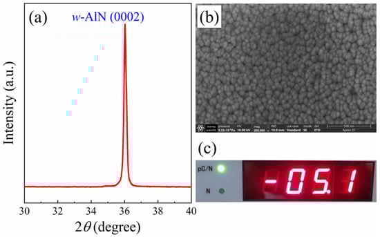 The thickness of the piezoelectric layer is a critical parameter in the design of ultrasonic transducers, as it significantly influences the transduction efficiency and overall performance of the device. In this section, we focus on the piezoelectric layer thickness design to enhance the intensity of the AlN thin film ultrasonic transducer. The AlN thin film was deposited by RF magnetron sputtering (shown in Figure 4). To facilitate the sample preparation, the samples of the XRD pattern and SEM image were deposited on Si(100). The XRD result shows the (0002) preferred orientation for the AlN thin film suggests that the film has a crystallographic texture on the c-axis. The SEM image clearly demonstrates a uniform distribution of fine grains on a dense surface. The d33 value, which is a measure of the piezoelectric coefficient, is given as 5.1 pC/N for the AlN thin film. This value is close to the reported value of 5.5 pC/N [15]. Overall, the combination of XRD, SEM, and d33 measurements provides a comprehensive assessment of the AlN thin film’s quality, indicating that it has been successfully prepared with desirable characteristics for its intended applications.