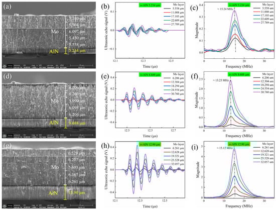 The cross-SEM image (a,d,g), ultrasonic signal (b,e,h), and frequency response (c,f,i) of AlN transducers with different thickness of AlN and Mo film layer deposited by RF magnetron sputtering.