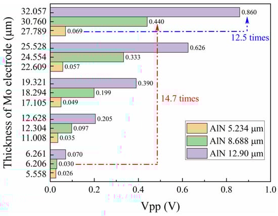 The Vpp varies with the thickness of Mo electrode for AlN thin film transducers.