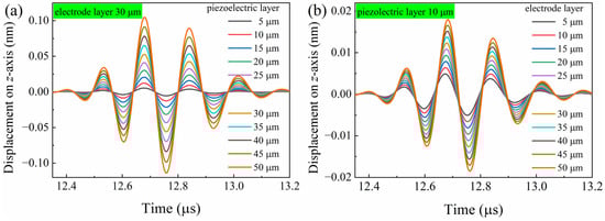The simulated ultrasonic echo signals with different thickness of piezoelectric layer (a) and electrode layer (b) by finite element method.