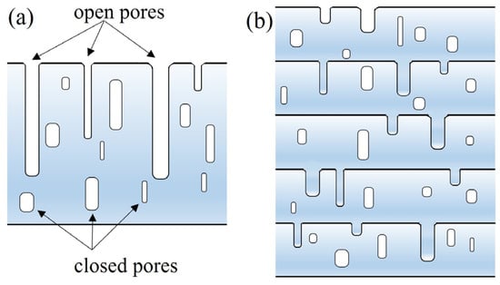 In physical vapor deposition techniques, it is difficult for deposited films to reach thicknesses of 30 μm or even 50 μm due to the presence of layer stress and intrinsic stress that can lead to delamination or cracking. In our work, the multilayered Mo electrode structure was successfully deposited layer-by-layer using RF magnetron sputtering, achieving a thickness of 30 μm without any delamination (shown in Figure 5a,d,g). Generally, the layer stress between layers of Mo is greater than that between Mo and AlN. Furthermore, the layer stress between Mo and AlN is greater than that between GH4169 and AlN. So, delamination will not occur in the multilayered Mo structure unless the intrinsic stresses of the multilayered structure are greater than the layer stress between Mo and AlN or between GH4169 and AlN. In addition, there are open pores and closed pores in the continuously deposited films [32], as shown in Figure 8a. Closed pores within the film cannot exchange water with the atmosphere during the heating or cooling processes. In contrast, open pores on the surface can exchange water with the atmosphere, and this exchange will be detrimental to the propagation of ultrasonic signals, potentially causing attenuation or distortion. The open pores on the surface can be filled in as subsequent layers are deposited using the layer-by-layer method, as shown in Figure 8b. The densification in a multilayered structure is expected to be greater than that in a single-layer film of equivalent thickness. This increased densification, coupled with strong interfacial bonding—a critical feature that ensures efficient electrical signal transfer across the multilayered electrode—significantly enhances the mechanical properties of the thin film. Consequently, the multilayered Mo structure can have a clear impact on the ultrasonic signals of a piezoelectric device.