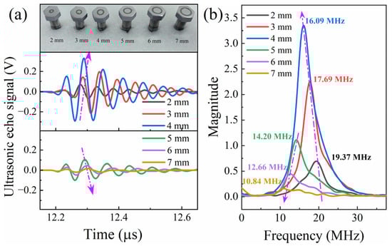 The diameter of the electrode in ultrasonic transducers determines the active area of the ultrasonic signals. Nevertheless, a larger diameter for the electrode is not necessarily better. The transducers with varying electrode diameters were deposited on GH4169 bolts by RF magnetron sputtering to explore the ultrasonic echo signals, as shown in Figure 9a. The applied gain of 40 dB was set in the ultrasonic pulser-receiver to optimize the signal-to-noise ratio. Observations show that the intensity of ultrasonic echo signals increases as the electrode diameter increases from 2 mm to 4 mm, but decreases when the diameter is further increased from 5 mm to 7 mm. Figure 9b gives the frequencies of the ultrasonic signal obtained using the FFT method. As the electrode diameter increases, the center frequency decreases and the waveform of the ultrasound signal becomes elongated. The reduction in the center frequency with larger electrode diameters can be attributed to the altered boundary conditions at the interface between the electrode and the piezoelectric layer, affecting the resonance characteristics of the transducer [33]. Generally speaking, lower-frequency waves tend to penetrate materials more deeply than higher-frequency waves, but the frequency magnitude and signal intensity decrease when the electrode diameter reaching exceeds 4 mm. Further study is needed on this aspect of simulation modeling.