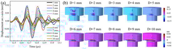 The simulated ultrasonic echo signal of AlN transducers with different diameters of electrode layers by finite element method (a), the ultrasonic signal with different diameters of electrode layers at 12.5 μs (b).