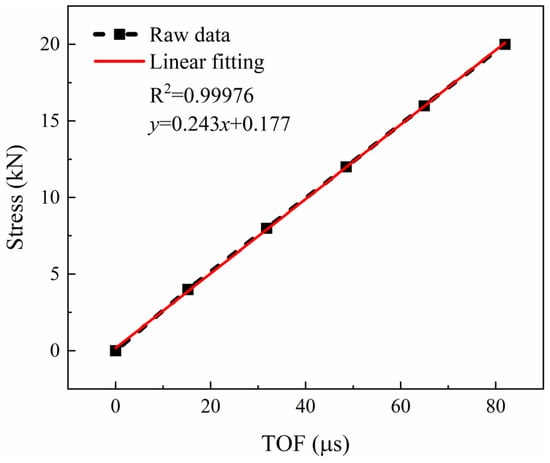 To further investigate the suitability of the AlN transducer for bolt applications, the bolts were load-tested at room temperature. The pretightening stress can be obtained by Equation (1) and the steps for measuring the pretightening stress of the bolt are as follows: Firstly, install the bolt on the tooling, test the echo signal of the unstressed state, and set the position of the echo signal to zero. Secondly, a known force equivalent to the pretightening stress is applied by the tension machine. Record the TOF between the echo signals obtained before pretightening and after setting to zero. Thirdly, plot the data on a graph to create a calibration curve that shows the relationship between the pretightening stress and the TOF. Finally, use the calibration curve to predict the pretightening stress. The AlN transducer sample, featuring an AlN layer measuring 12.90 μm and a Mo layer measuring 32.057 μm, and exhibiting the strongest intensity echo signal, was calibrated and the pretightening stress was measured. Figure 11 shows the calibration curve for a tension ranging from 0 to 20 kN. The determination coefficient R2 of the fitting line is 0.99976, confirming that the calibration process for measuring the pretightening stress is highly accurate. A series of stress tests was applied to the AlN transducer and the predicted stress was obtained by the calibration curve, as shown in Table 1. The percentage error was obtained from the predicted stress and actual stress. It was noted that the absolute error of this system was below ±0.2 kN, and the relative error was less than ±2.5%. This result is more accurate than those reported in other literature for both the PMTS [5] and other ultrasonic methods [30].