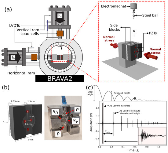 In laboratory settings, acoustic emissions (AEs) are detected as elastic waves generated by the rapid release of energy from breaking processes, resembling small-scale earthquakes. These AEs provide valuable insights into the physics of seismic events. Pioneering studies have used continuous AE monitoring to investigate rock deformation processes in various laboratory experiments [1,2,3,4,5,6], establishing AE activity as a reliable proxy of the stress state of laboratory faults. In experiments with bare rock surfaces or glass beads, AE activity follows the Gutenberg–Richter relation, where the b value varies with the stress state [7,8,9,10,11] and fault roughness [12]. Analyzing the spatial and temporal distributions of AE hypocenters preceding main stick–slip instabilities can provide fundamental insights into earthquake nucleation mechanisms [11,13,14,15,16,17]. By adapting seismological techniques to laboratory settings, comprehensive characterization of focal AE mechanisms [18,19] and source parameters [16,20,21] has become feasible. Comparing laboratory estimates of AE source parameters to seismological estimates of earthquake sources reveals a continuum in the scale relationship between seismic moment () and corner frequency (), expressed as [22]. This relationship implies a consistent stress drop across a wide range of scales, encompassing laboratory experiments, underground in situ experiments, induced seismicity, and natural earthquakes [23,24,25,26]. The apparent scale-invariant nature of stress drop suggests that the underlying mechanisms of laboratory AEs and earthquakes are fundamentally similar. However, seismologically derived static stress-drop values are subject to considerable uncertainty due to assumptions about the employed source model and challenges in accurately determining corner frequency () [23,27,28,29]. This uncertainty results in a wide range of estimated stress drops spanning four orders of magnitude, from 0.01 MPa to 100 MPa, observed across the whole spectrum from small-magnitude (~−8) laboratory AEs to large earthquakes exceeding magnitude 6 [20,21,23,30,31].