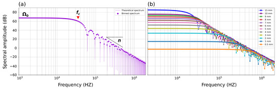 (a) Theoretical spectrum obtained from the FFT of the theoretical force–time function (violet shaded line) for a 7 mm ball diameter, where is the spectrum amplitude of the flat portion of the spectrum, is the corner frequency, and n is the high-frequency decay. The violet points represent the median value for each bin (see Section 4.3 for the binning procedure). (b) Binned source spectra of the theoretical force–time function for all ball sizes ranging from 0.5 mm to 15 mm.
