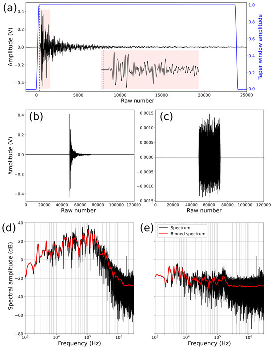 Calibration analysis for a ball drop with a 10 mm diameter recorded with the Sh sensor. (a) Windowing procedure for one AE, with the blue line representing the Tuckey taper window and the blue vertical dashed line representing the point where the taper window reaches 1. A zoomed-in view of the first µs is shown in the inset. (b) Acoustic signal after tapering and zero padding of the AE. (c) Acoustic signal after tapering and zero padding of the noise before the AE. (d) Fourier spectrum of the AE. The raw spectrum is shown in black, and the binned spectrum is represented in red. (e) Fourier spectrum of the noise. The raw spectrum is shown in black, and the binned spectrum is indicated in red.