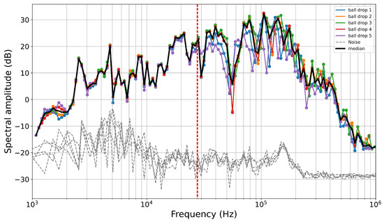Raw spectra for five ball drops using a ball with a diameter of 10 mm. The red dashed line indicates the corner frequency of 27.6 kHz derived from Hertzian theory. To retrieve the calibration function, only the portion where is considered, while represents the high-frequency decay and is not considered in the calculation of the instrument apparatus response.