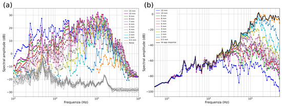 (a) Raw spectra of all ball drops with an SNR > 10 dB. Each line represents the median of the five ball drops performed for each ball. The gray lines represent the noise associated with each spectrum. (b) Spectra corrected according to the value derived from the theoretical spectra. The instrument apparatus response is represented by the thick black line.