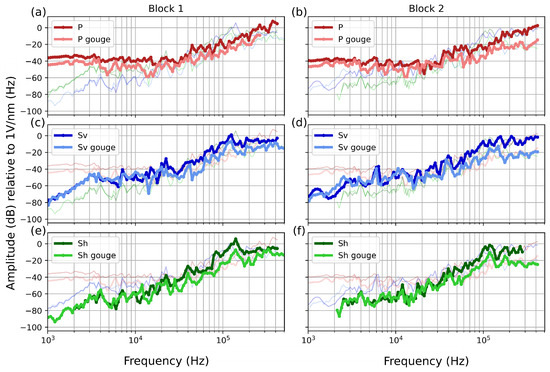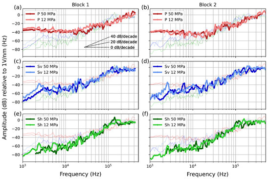 Instrument apparatus response functions for different sensors at various normal stresses and for both blocks. (a,b) The calibration function for the P sensor at 50 MPa (dark red) and 12 MPa (light red). The slopes indicate the operational mode of the sensor (0 dB/decade, displacement sensor; 20 dB/decade, velocimeter sensor; 40 dB/decade, accelerometer sensor). (c,d) The calibration function for the Sv sensor at 50 MPa (dark blue) and 12 MPa (light blue). (e,f) The calibration function for the Sh sensor at 50 MPa (dark green) and 12 MPa (light green). All calibration functions are shown in each plot to facilitate comparison.