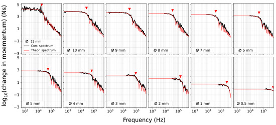 By integrating the force–time function () from 0 to , we derive the change in momentum (). This value is essential in correcting the spectrum of ball drops and computing using Equation (3). Specifically, for frequencies of (where the spectrum is flat), . In this way, the raw spectrum is corrected for the change in momentum by dividing by . Consequently, for , the corrected spectra of all ball drops collapse into a single curve that represents the instrument apparatus response (see Section 4). For a more detailed description of this theoretical framework, we refer to McLaskey and Glaser [45], McLaskey et al. [35], and McLaskey and Lockner [21].