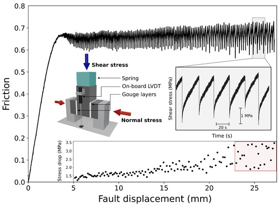 The test experiment is performed in a double direct shear configuration using a 3 mm quartz gouge layer (Min-U-Sil 10) with an average grain size of 3.4 µm. The experiment is performed under 100% humidity conditions, applying a constant loading rate of 10 µm/s. To modulate the machine stiffness and obtain stick-slip events (i.e., lab-quakes), we use a spring in series with the vertical piston (for details on the experimental procedure, see [48,49,50,51]).