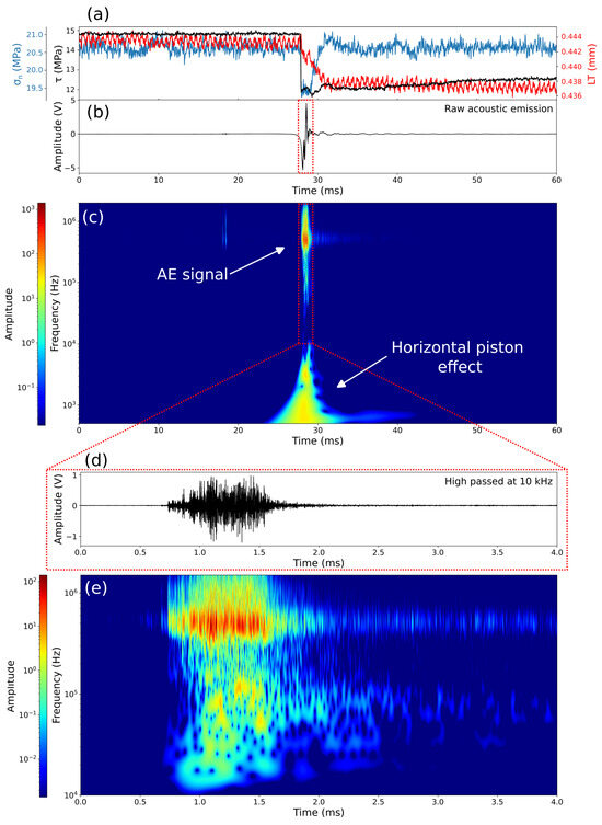 However, the AEs from the gouge occur at much higher frequencies (>100 kHz) than the signal caused by piston movement. This clear frequency separation between block deformation and AEs allows us to isolate the AEs by applying a high-pass filter to the waveform at 10 kHz (Figure 11d,e).