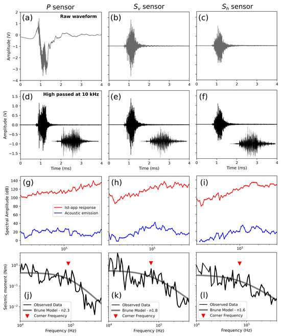 where is the spectral seismic moment as a function of the frequency and is the total released seismic moment. We allow the high-frequency decay (n) to vary between 1.5 and 5 to obtain a more accurate representation of the source and to account for the correlation between this decay and event size, with smaller sources exhibiting faster decay rates [31,54]. The Brune fit and for the source spectra of the P, Sv, and Sh sensors are reported in Figure 12j, Figure 12k, and Figure 12l, respectively.