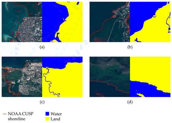 Examples of annotated satellite images from SNOWED. Each subfigure (a–d) shows the true-color image on the left and the corresponding annotation on the right. NOAA CUSP water edge measurements used to create the annotations are also shown.