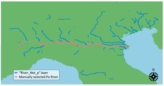The EU-Hydro dataset is divided into packages containing data relative to a single basin. The present work uses the package relative to the Po River, EU-Hydro-Po-FGDB v013, and, in particular, the layer River_Net_p. This layer provides natural watercourses wider than 50 m in the form of polygons. Figure 2 shows the EU-Hydro mapping of the river network in North Italy, highlighting the Po River basin.