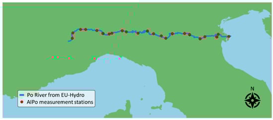 The Interregional Agency for the Po River (AIPo) [] provides water level measurements acquired at 30 gauging stations distributed along the entire path of the river, with seven pairs of them installed in close proximity to each other (few tenths of meters apart). Therefore, on a geographical scale, there are 23 monitored locations, shown in Figure 3. Water level is measured with a frequency of 5–30 min, depending on the specific gauge station.