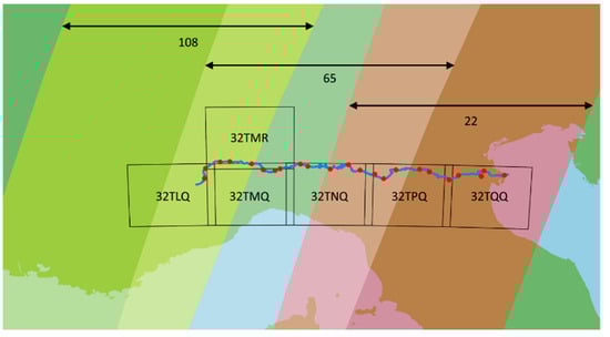 Tiles are filtered and retrieved by using the Copernicus Data Space Ecosystem [], which allows selection based on tile identifier, orbit number, and cloud cover (as well as other parameters that we do not use). We select tiles with identifier and orbit number in Table 1, and with cloud cover of less than 40%. A greater limit for cloud cover (e.g., 60%) can also be used, with the drawback of increasing the quantity of downloaded data and processing time.
