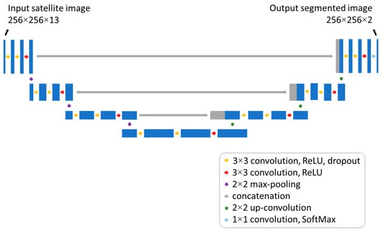 The input of the neural network is a 256 × 256 image with 13 channels, corresponding to the Sentinel-2 Level 1C bands, while the output is a 256 × 256 × 2 matrix, with the values of probability of water and non-water, respectively, in each of the two channels. Each pixel is classified as water when the associated probability is greater than 50%.