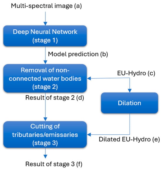 In the second stage, all non-connected water regions in the DNN prediction are analyzed. The regions that do not intersect the EU-Hydro river area are considered disconnected from the river basin and are discarded (Figure 7d), leaving in the map only the river with its tributaries/emissaries.