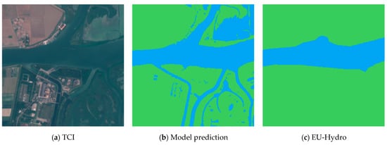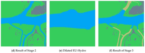 In the first stage, the most important, the sub-tile is processed by the DNN, and the water in the image is identified. The result of this stage is represented in Figure 7b. As depicted, the DNN prediction also includes water bodies that are not part of the river basin. The second and the third stage have the purpose of excluding these water areas, which are not related to the river regime, by using the “nominal” river area provided by EU-Hydro, shown in Figure 7c.